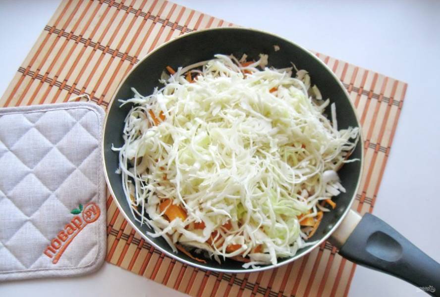 Капусту нарежьте тонкой соломкой и добавьте в сковороду к остальным овощам. Посолите по вкусу, налейте воду, накройте крышкой и тушите овощи почти до готовности, периодически перемешивая, на огне чуть ниже среднего.