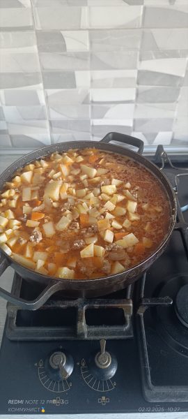 За время готовки фарш полностью приготовится. Картофель станет мягкий. Тушеная картошка с фаршем готова!