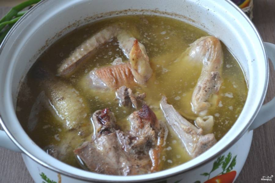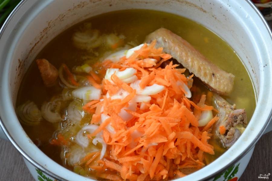 Подготовьте все необходимые ингредиенты. Морковь и лук очистите. Курицу советую покупать домашнюю, она получается в разы вкуснее. Возьмите голени, бедрышки, крылья и шею.