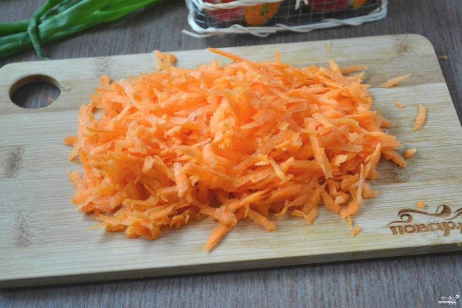 Крупную морковь натрите на крупной терке или порежьте соломкой.