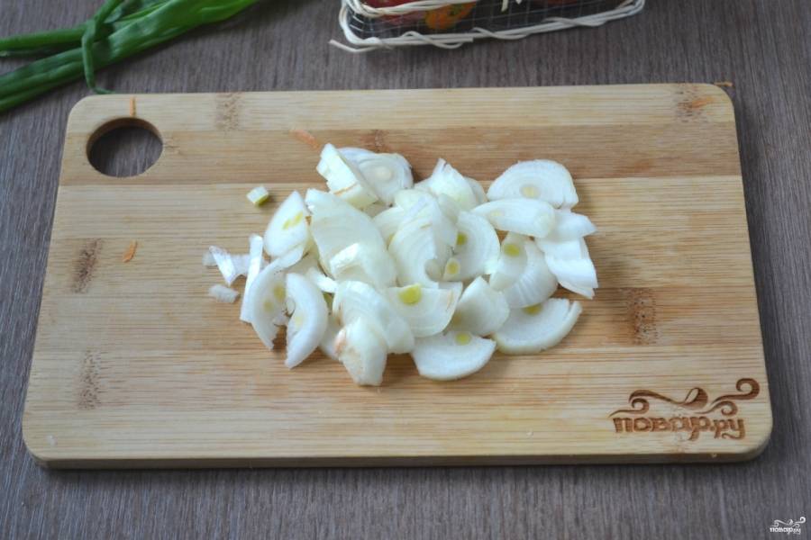 Лук порежьте полукольцами. Если у вас луковицы крупные, то можно порезать их и четвертькольцами.