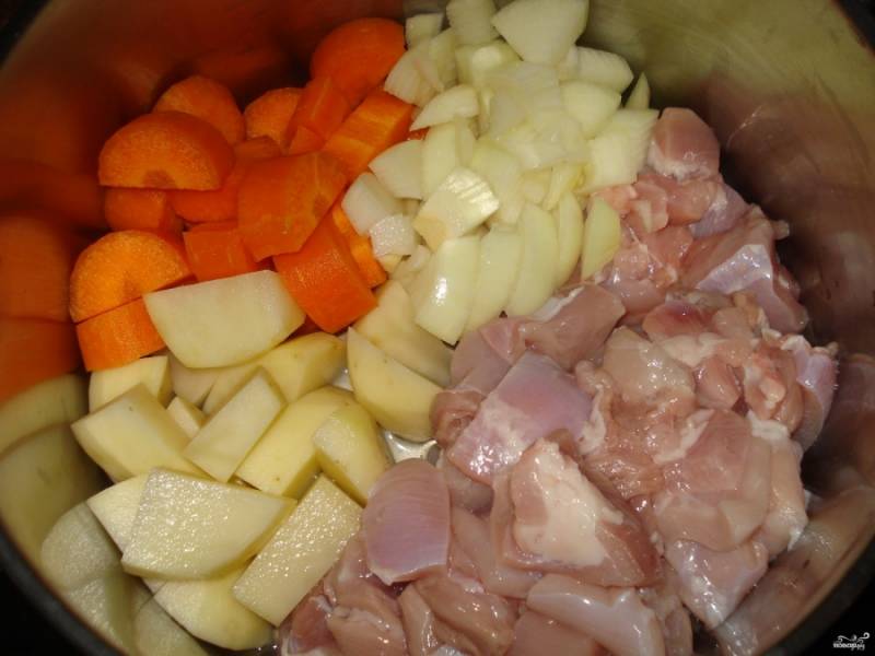 1. Курицу, картошку, лук и морковку чистим, нарежем кубиками и начинаем обжаривать на небольшом огне на растительном масле в кастрюле с толстым дном. Желательно под крышкой, чтобы сок из курицы никуда не уходил, и в нем тушились картошка и морковь.