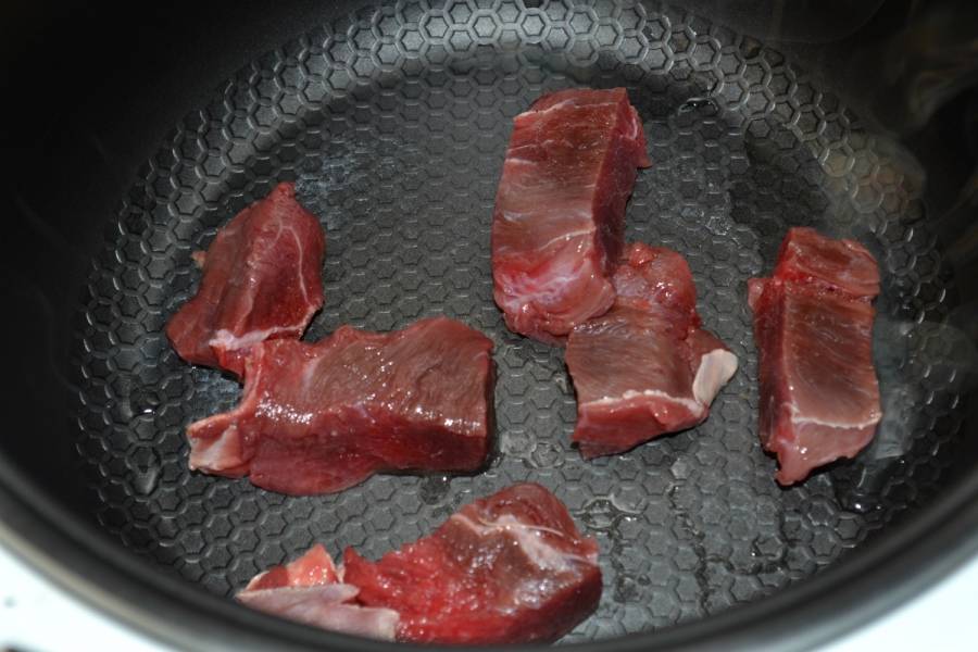3. Положите мясо в мультиварку, добавьте подсолнечное масло. Включите режим жарки на 30 минут.