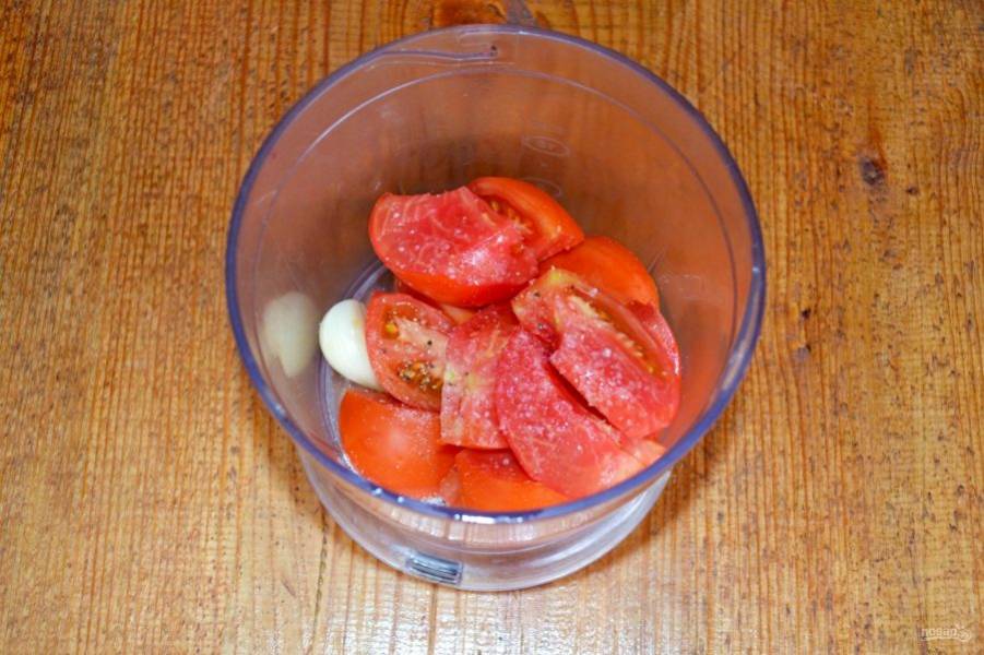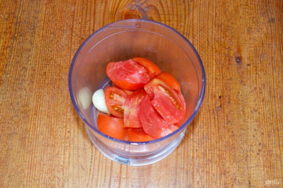 Для приготовления соуса нарежьте помидоры, очистите чеснок, добавьте кусочек острого перца.