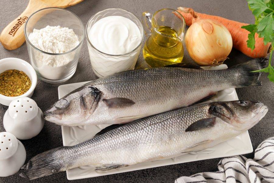 Подготовьте все ингредиенты по списку. Рыбу предварительно разморозьте на нижней полке холодильника, если необходимо. Сметану можете брать любой жирности, у меня была 15%. Специи берите на свой вкус, у меня была готовая смесь для рыбы.