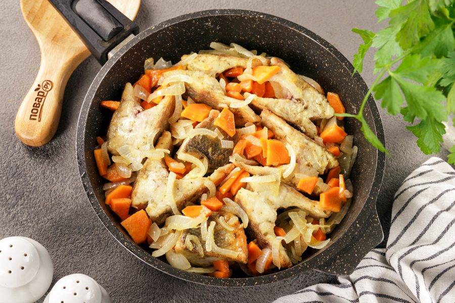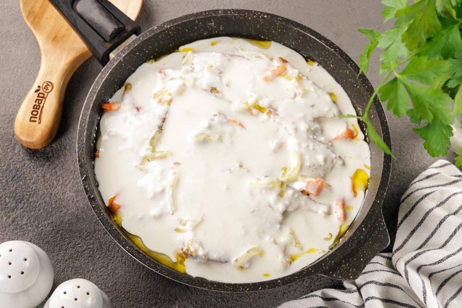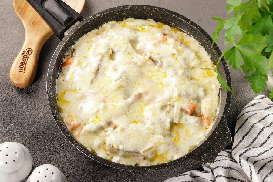 Соедините сметану с 1 ст.л. муки. Тонкой струйкой влейте кипяток, это поможет сметане в процессе тушения не свернуться. Посолите соус по вкусу, добавьте молотый перец, если желаете и полейте им рыбу с овощами.