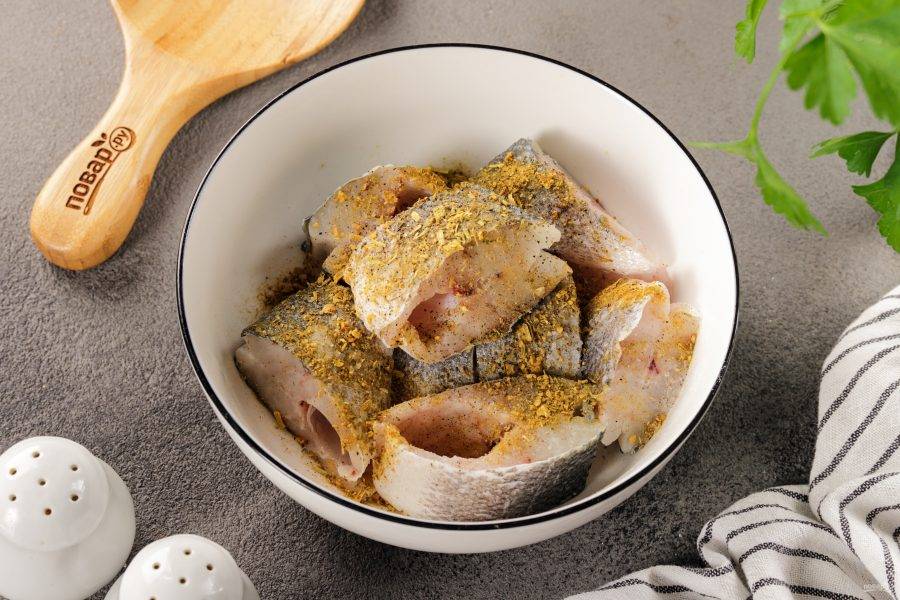 Сначала займитесь разделкой рыбы. Очистите её, удалите внутренности, голову, хвост, плавники. Промойте и нарежьте на стейки, толщиной около 2 см. Вес рыбы я указала уже вот в таком подготовленном виде.