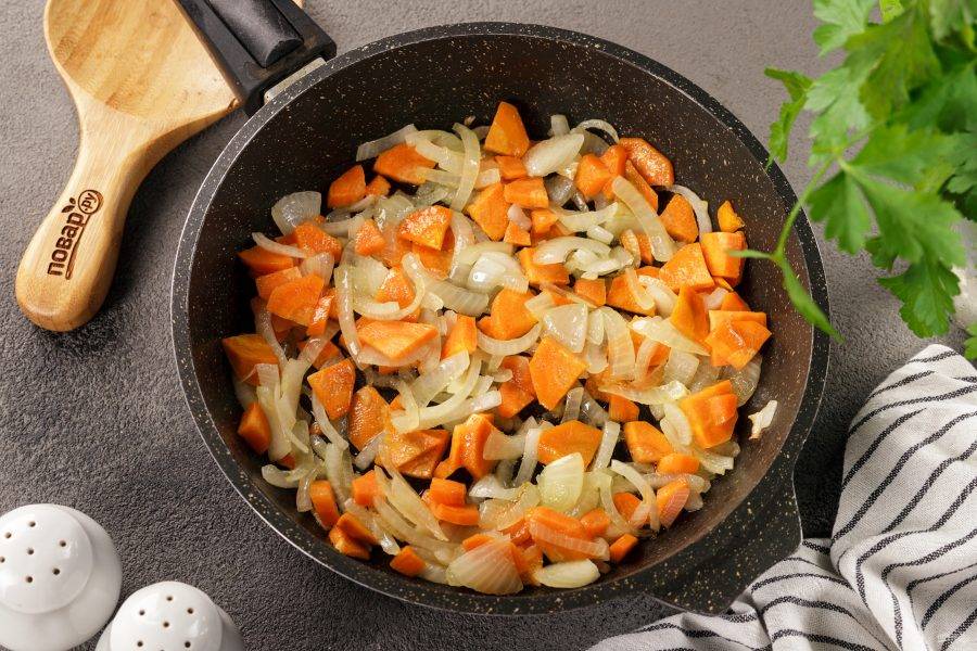 Обжарьте овощи до мягкости, посолите по вкусу. Переложите пока на тарелку.
