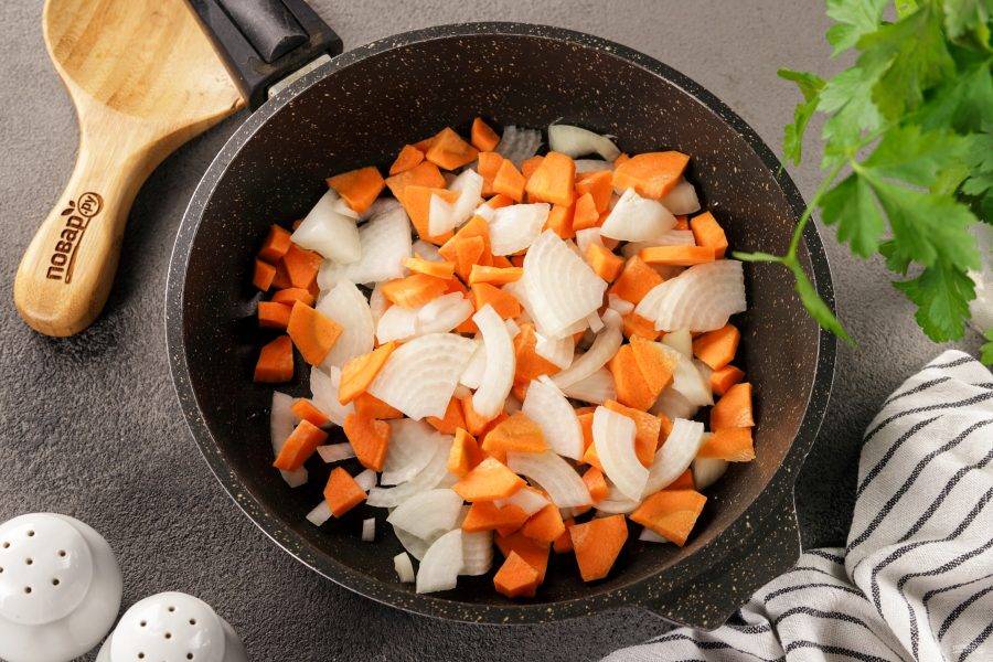 На сковороде разогрейте 1-2 ст.л. растительного масла. Выложите нарезанные лук и морковь. Нарезка может быть любая, какая вам больше нравится, мы любим покрупнее.