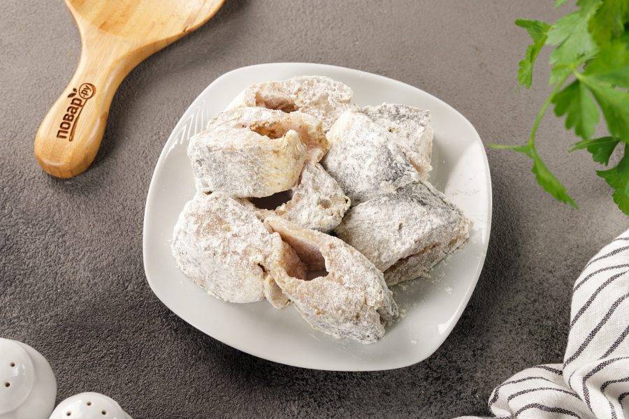 Обваляйте кусочки рыбы в муке, мне хватило пару ложек.