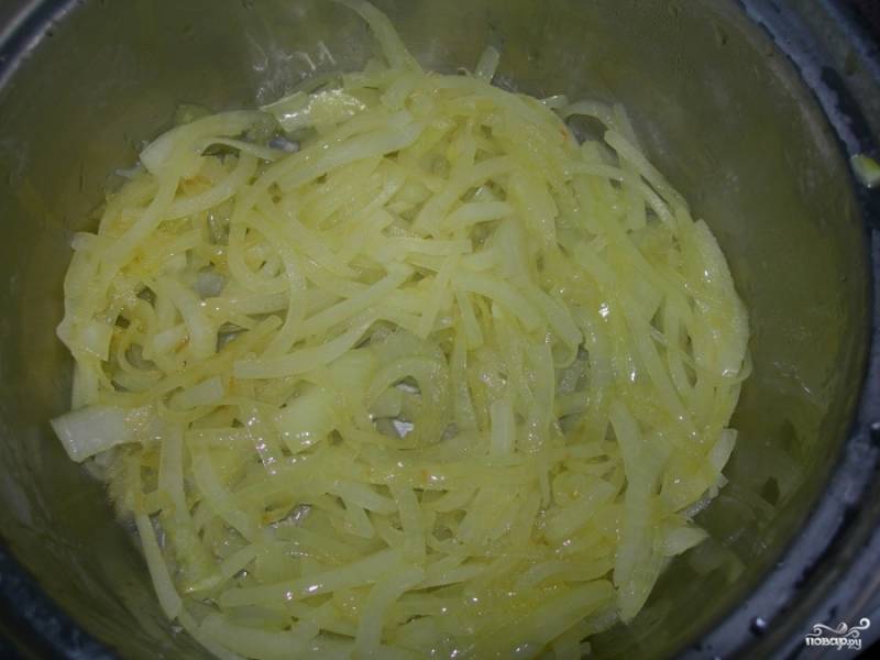 И тушим его в толстостенной сковородке или кастрюле в небольшом количестве оливкового масла до мягкости.