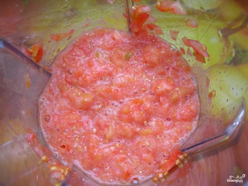 Помидоры очищаем от кожуры (опустив на пол минуты в кипяток) и измельчаем при помощи блендера или нарезаем мелкими кубиками.