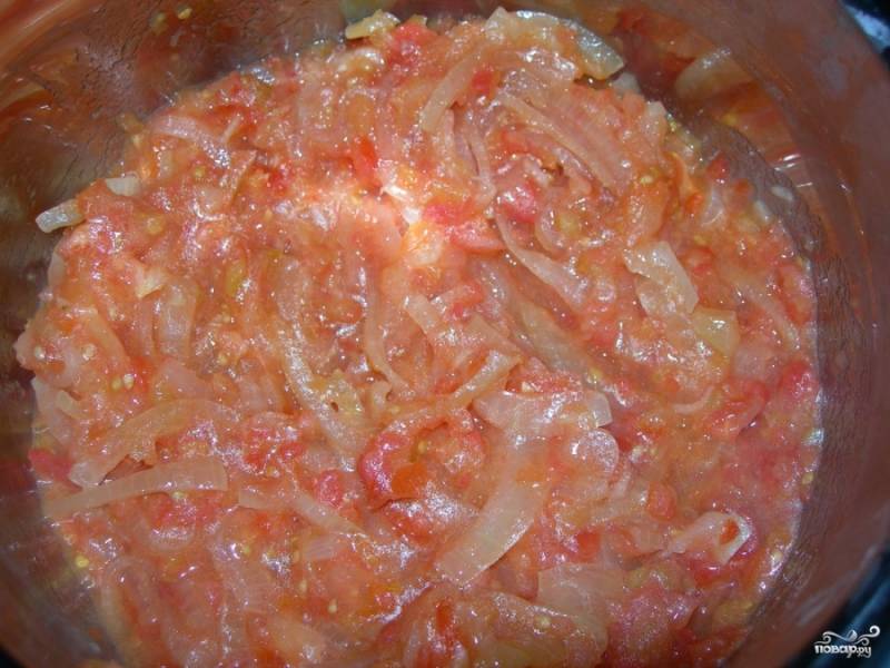 Помидоры добавляем к луку, так же бросаем туда нарезанный мелко чеснок и тушим все в течении 7-10 минут.