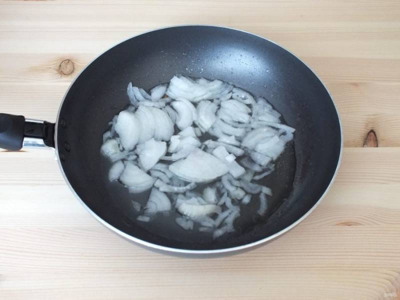 Лук нарежьте четвертинками и обжарьте до легкого колера.