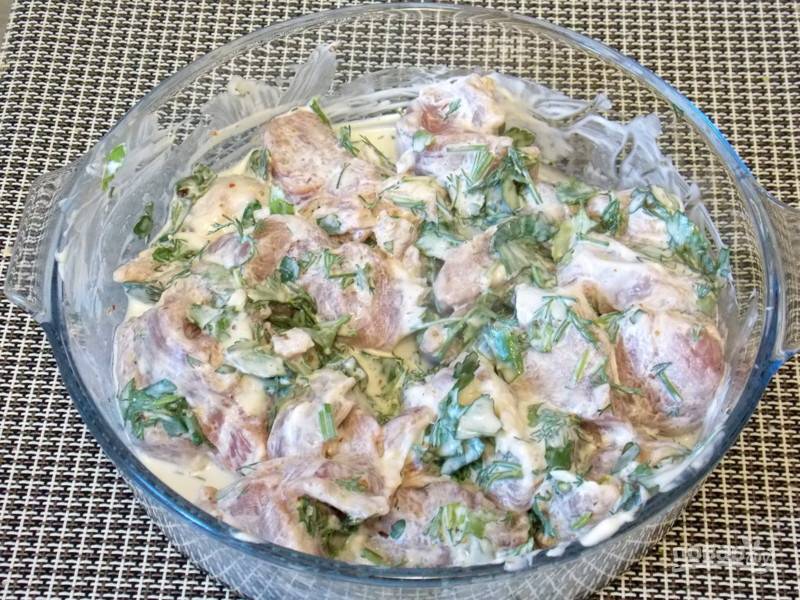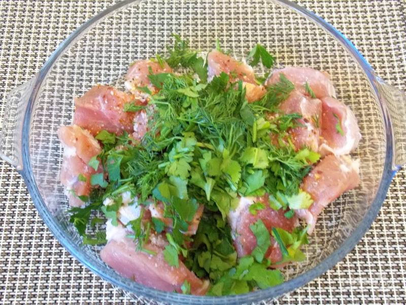 Сложите в форму для запекания мясо, посолите, добавьте нарезанную зелень и перемешайте.