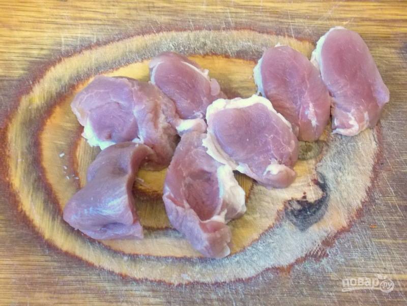 Порежьте мясо на кусочки толщиной 0.5 см.