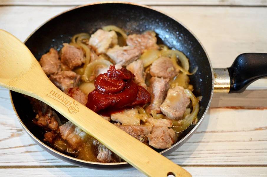 9. К мясу добавьте лимонный сок, корицу, мед и томатную пасту. Посолите, поперчите и перемешайте.