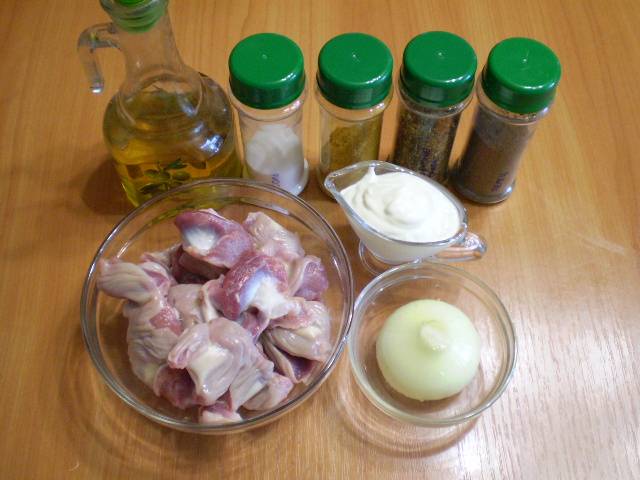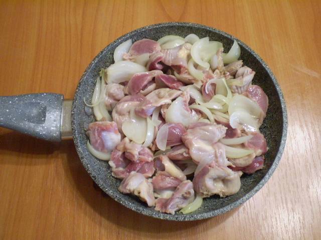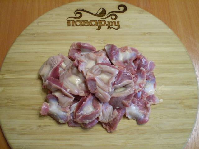 1. Приготовим продукты. Желудочки тщательно вымойте и удалите с них остатки пленок и жир.