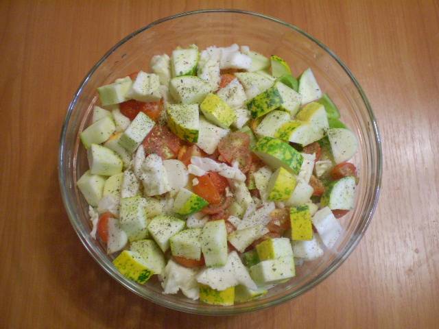 Овощи перемешайте, посолите, добавьте любимые специи. Полейте немного маслом. Для диетического стола масло совсем исключите.