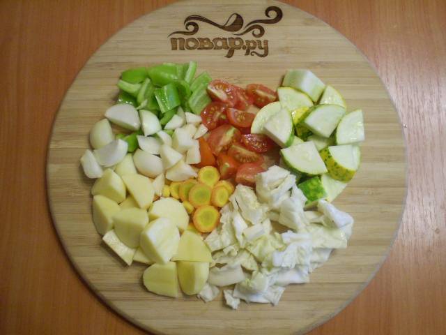Овощное рагу в кастрюле готовится легко. Сначала надо приготовить (очистить и нарезать) все продукты, а потом уложить их слоями в кастрюлю, поставить на огонь и ждать. Результат будет восхитительный!