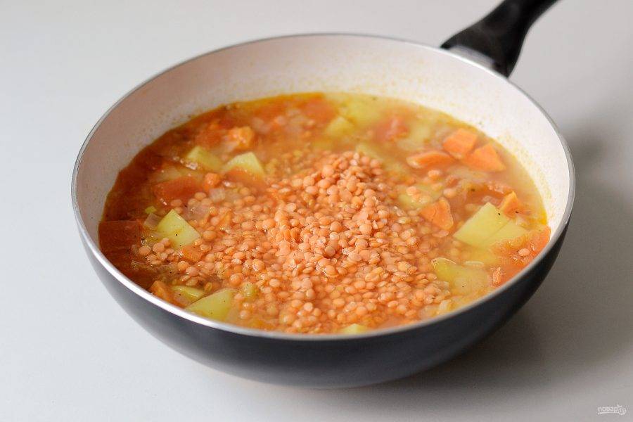 Добавьте промытую чечевицу. Перемешайте. Тушите еще 15-20 минут.