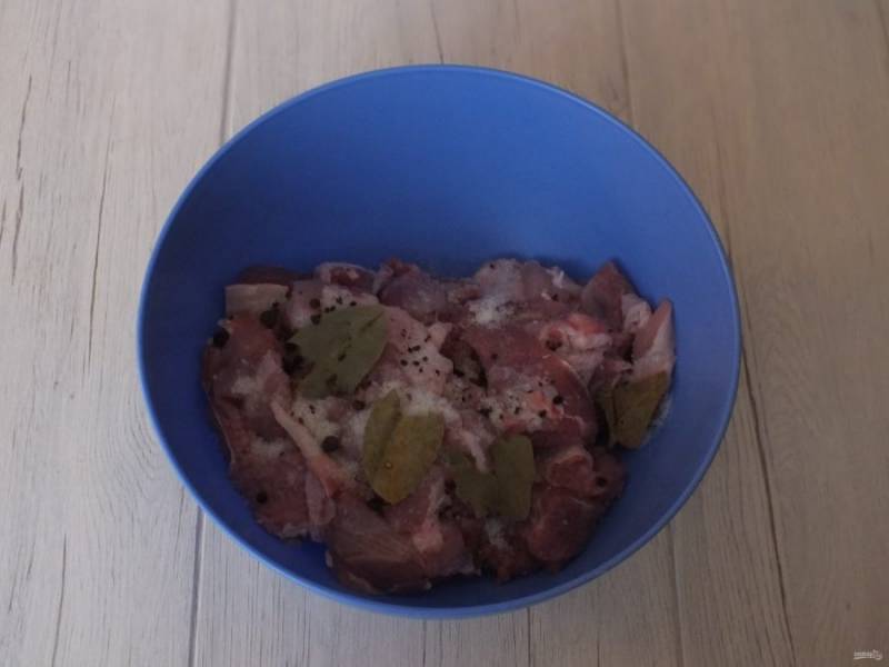 Переложите подготовленное мясо в глубокую чашу. Добавьте соль, перец, разломанный лавровый лист. Перемешайте.