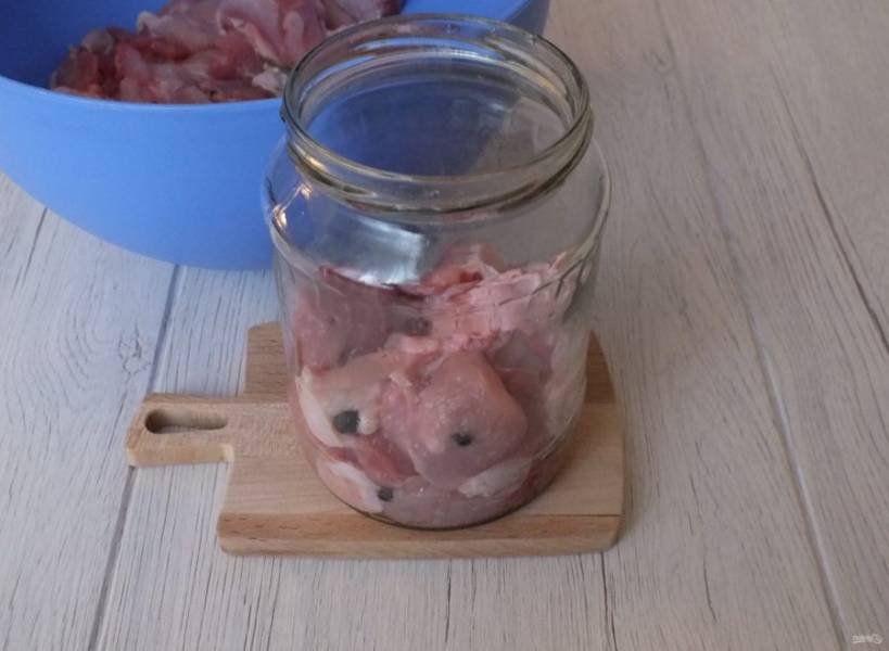В стерилизованные банки разложите мясо. Утрамбуйте. Я взяла 1 банку объемом 0,7 литра и 1 банку объемом 0,5 литра.
