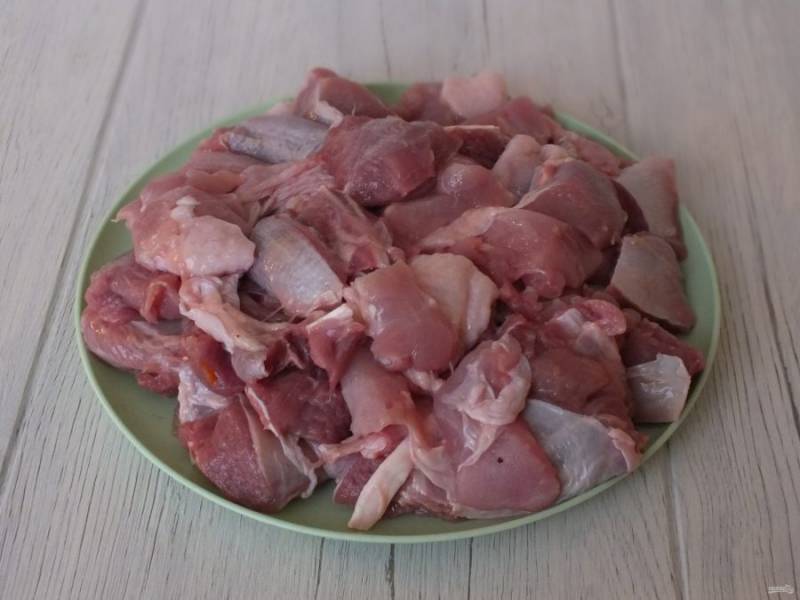 Индейку вымойте, просушите бумажным полотенцем. Отделите от костей и нарежьте небольшими кусочками. Кожу оставьте.