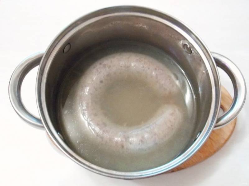 По правилам тутырму опускают в кипящую, соленую воду в подвешенном состоянии. Но это довольно проблематично, поэтому, будем делать по другому. В кастрюлю наливаем воду, солим и доводим до кипения. Затем убавляем огонь до минимума, опускаем нашу тутырму и при помощи ложки поддерживаем ее на весу. Она не должна соприкасаться с дном и боками кастрюли. Варим так колбасу в течение 10-15 минут. Она готова, когда будет самостоятельно плавать на поверхности.