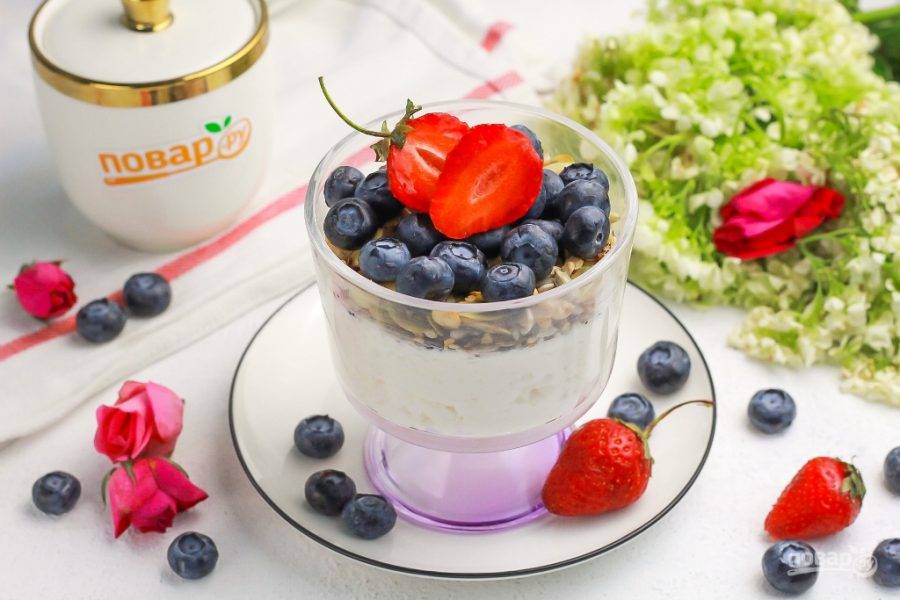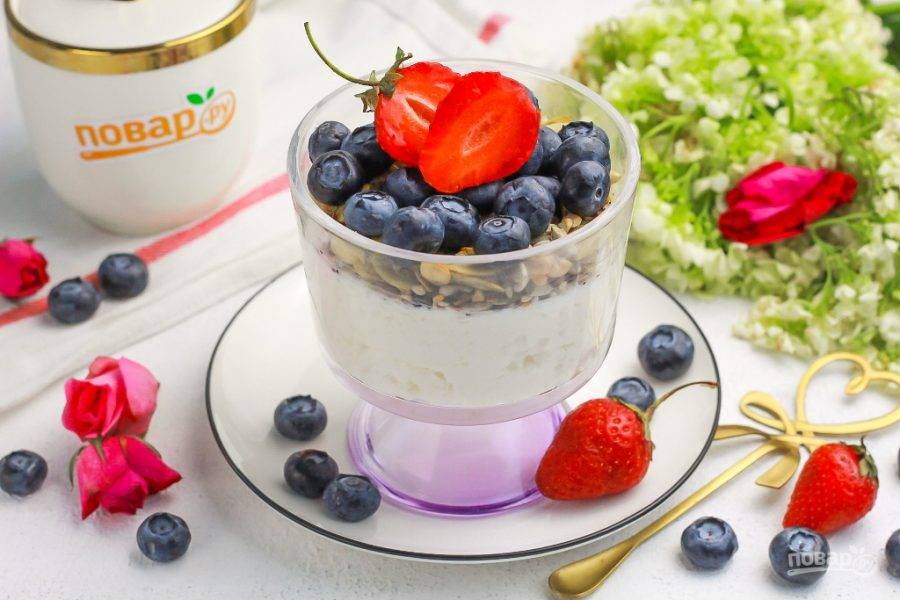 1. Используйте качественный творог с плотной консистенцией. Хороший творог 5–9 % жирности поможет добиться кремовой текстуры при смешивании со сметаной.2. При желании ягоды можно заменить на любимые фрукты.