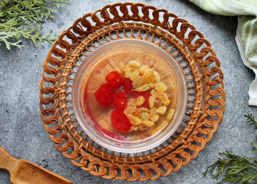 Сухофрукты сполосните и замочите на 5 минут в горячей воде. Снова сполосните и обсушите.