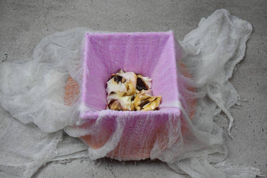 Топпинги для приготовления творожной мраморной пасхи готовы. Перед приготовлением пасхи, подготовьте творог. Его необходимо выложить в марлю и подвесить в прохладном месте или положить под гнет, чтобы избавиться от лишней влаги.