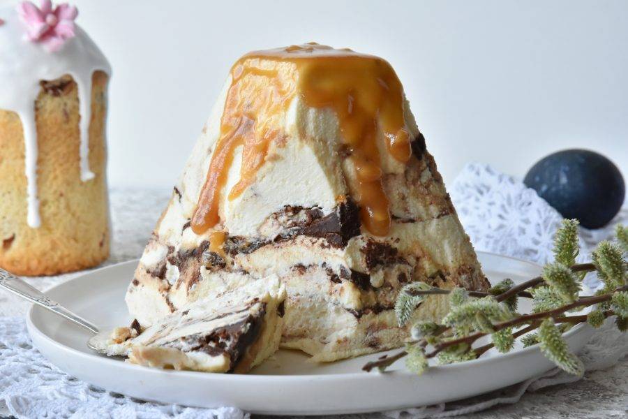 Пасхальный десерт из творога готов. Верх пасхи можно украсить шоколадом или карамелью.