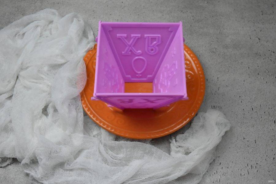 Подготовьте форму для оформления творожной пасхи. Форму установите на блюдо.