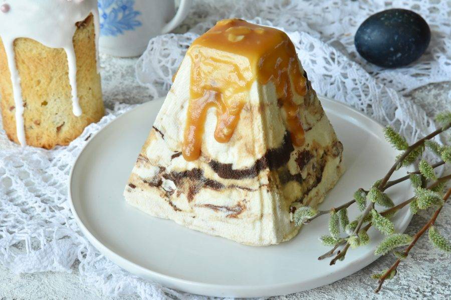 Готовим творожную пасху с начинкой из шоколада и карамели. Сочетание цветов, текстур, придаст творожной пасхе мраморный рисунок и очаровательный вкус.