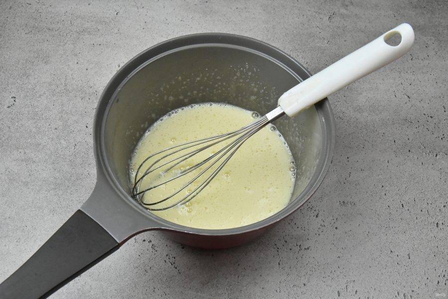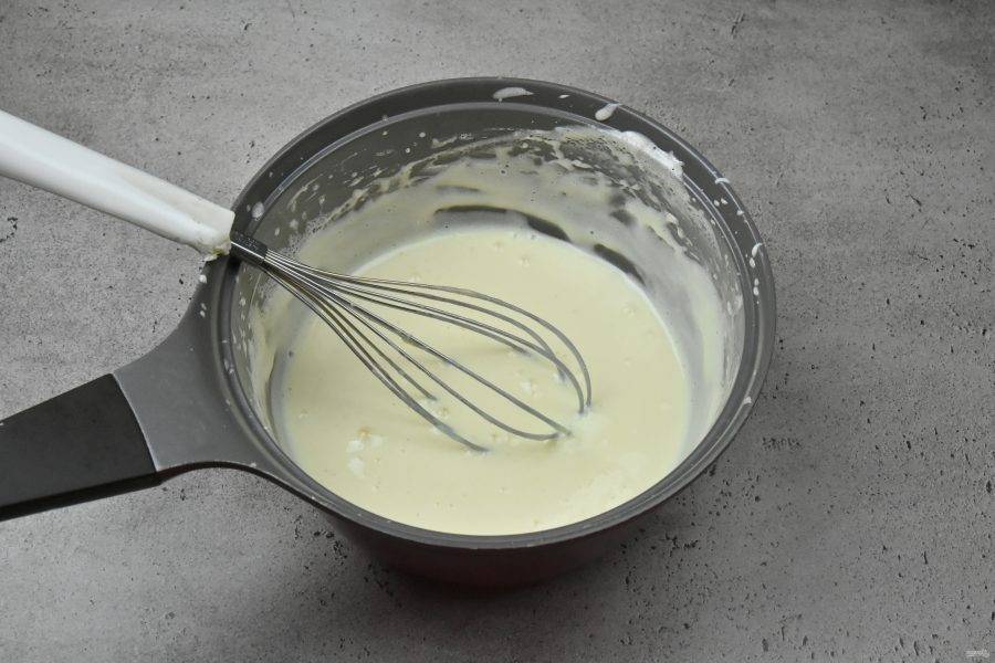 Поставьте сотейник на огонь и уварите смесь до загущения, продолжая непрерывно мешать крем венчиком. Снимите крем с огня и охладите.