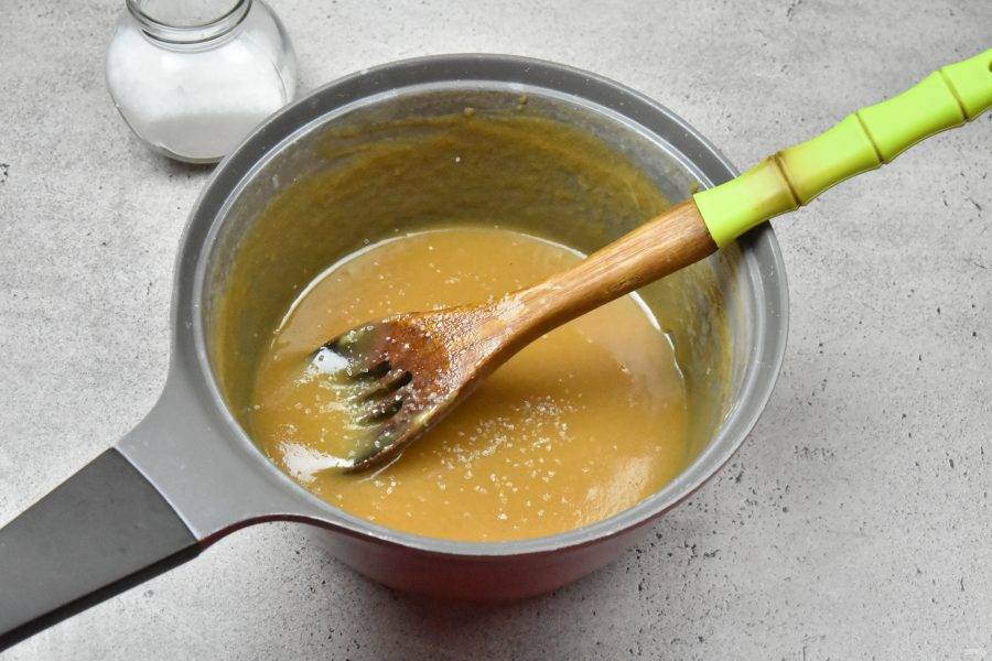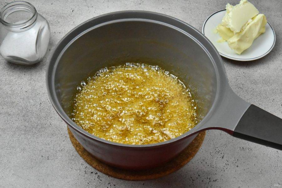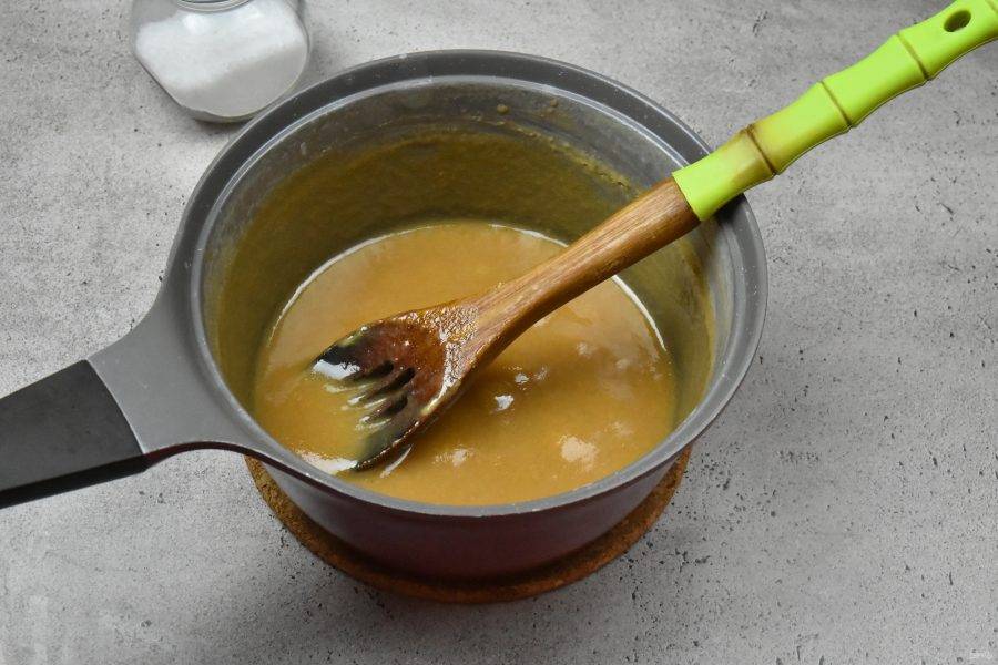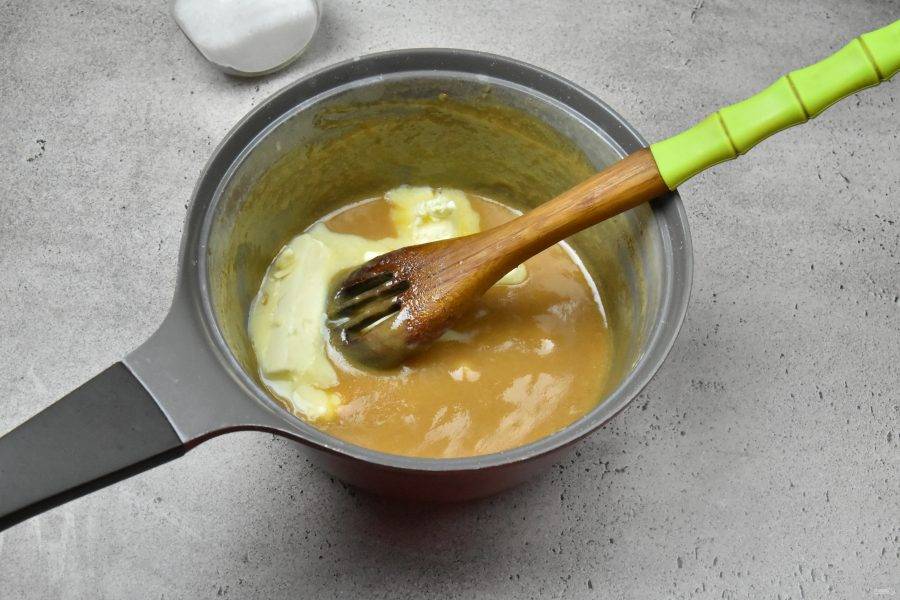Доведя карамель до желаемой консистенции, снимите с огня. Добавьте и вмешайте сливочное масло.