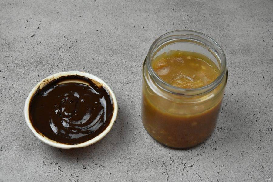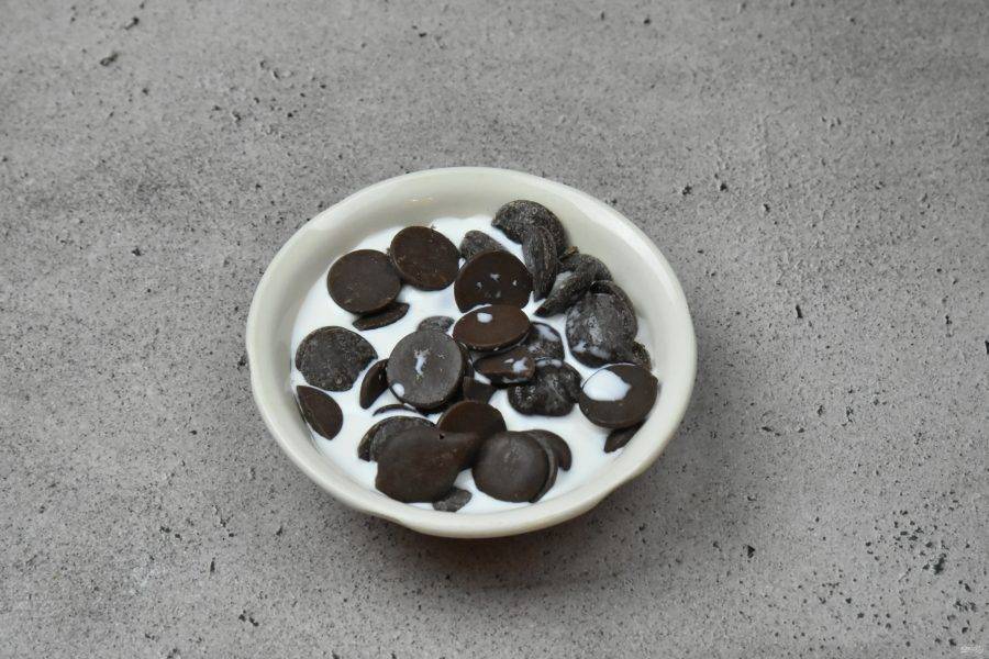Для второго топпинга соедините шоколад и 30 мл. сливок. Нагрейте смесь в микроволновой печи в течение 30 секунд. Перемешайте шоколадную массу до однородной, глянцевой консистенции.