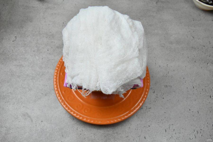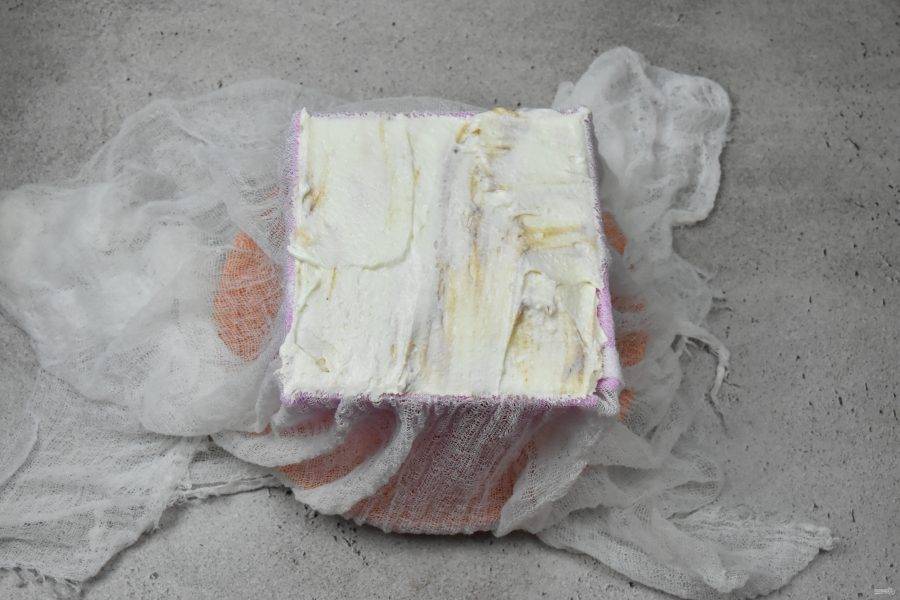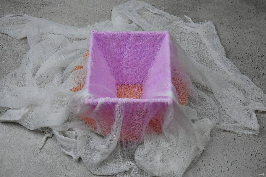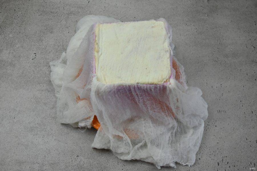 Края марли подверните на верх формы. Установите груз и поставьте всю конструкцию в холодильник.
