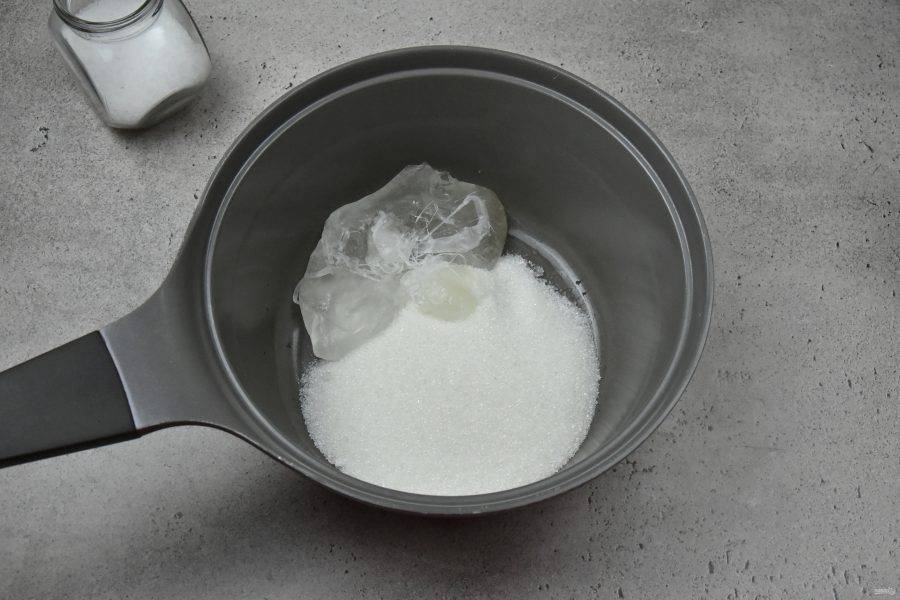 В сотейнике с толстым дном соедините сахар и глюкозный сироп, поставьте на огонь и доведите до расплавления сахара и объединения его с глюкозным сиропом. Массу не перемешивайте, размешивайте сироп путем покачивания сотейника.