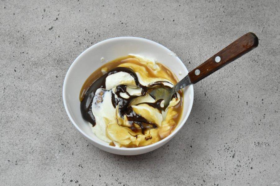 В творог добавьте подготовленный карамельный и шоколадный топпинги и слегка размешайте их в массе.