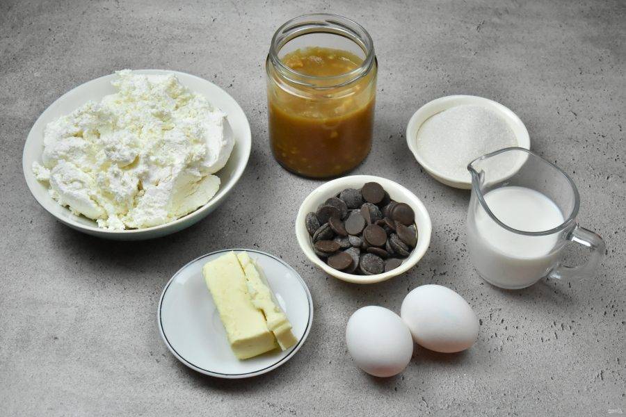 Подготовьте продукты для приготовления мраморной творожной пасхи. Вы можете использовать готовую карамель или приготовить ее самостоятельно. Жирность творога и сливок выбирайте на свое усмотрение. У меня творог 5% жирности, сливки 20%.