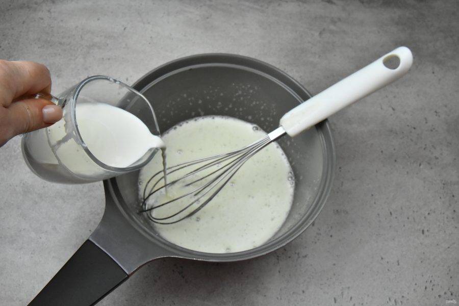 Сливки доведите до кипения и введите тонкой струйкой в яичную смесь, вмешивая их в смесь венчиком.