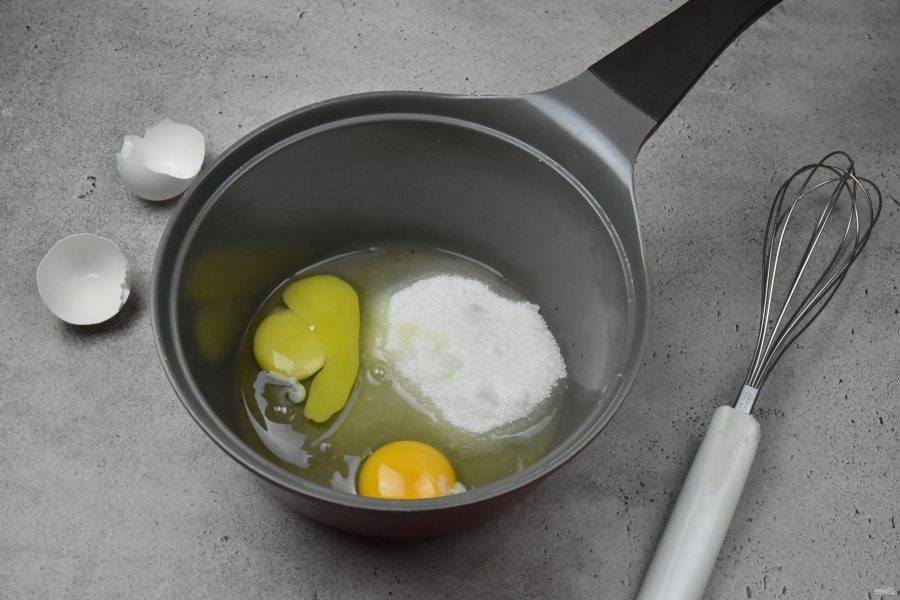 Для заварного крема соедините в сотейнике яйца и 90 граммов сахара.