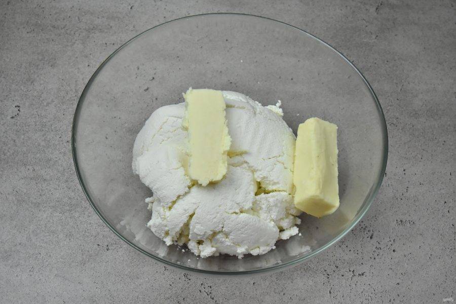В миску подходящего размера выложите подготовленный творог, сливочное масло и взбейте массу с помощью блендера до кремообразной консистенции.