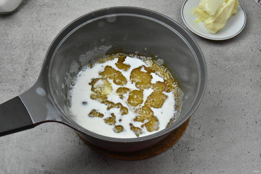 Сливки доведите до кипения и влейте в кипящую карамель. Осторожно! Кипящая масса начнет интенсивно бурлить.