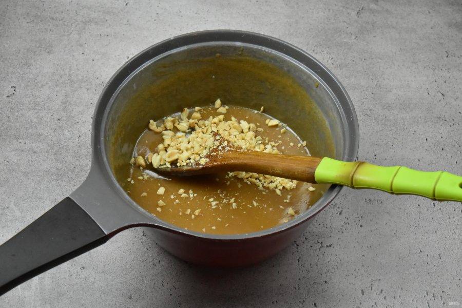 Всыпьте обжаренный арахис, перемешайте и переложите карамель в сухую стеклянную банку.
