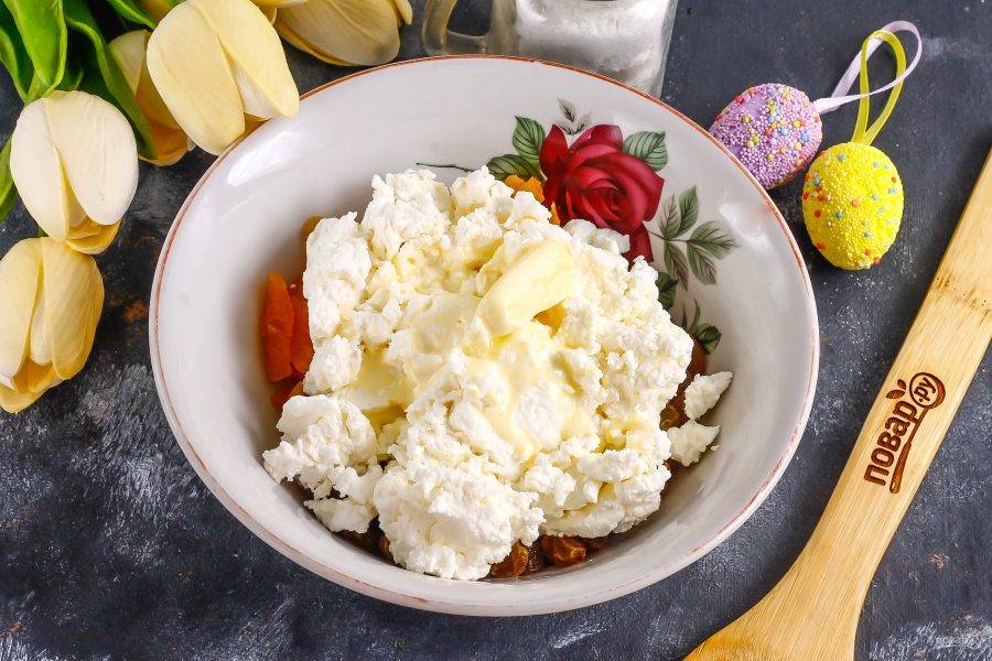 Выложите туда же творог любой жирности и всыпьте 1 щепотку соли, она оттенит сладость сухофруктов. На водяной бане или в микроволновке растопите сливочное масло, влейте в емкость.