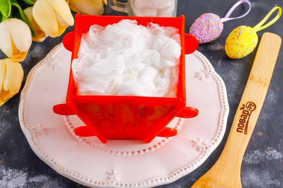 Застелите форму для десерта марлей или тонким хлопчатобумажным полотенцем. Выложите в нее творожную массу, плотно утрамбовывая.