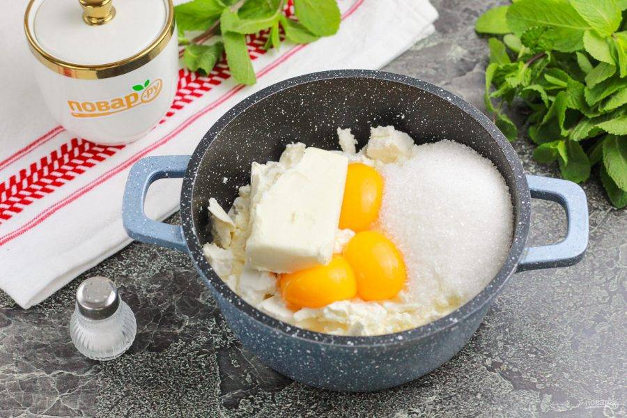 Творог разомните вилкой и выложите в казан или кастрюлю с антипригарным дном. Влейте сливки 33%, всыпьте соль и сахар. По желанию можете добавить немного ванильного сахара. Выложите желтки и масло.